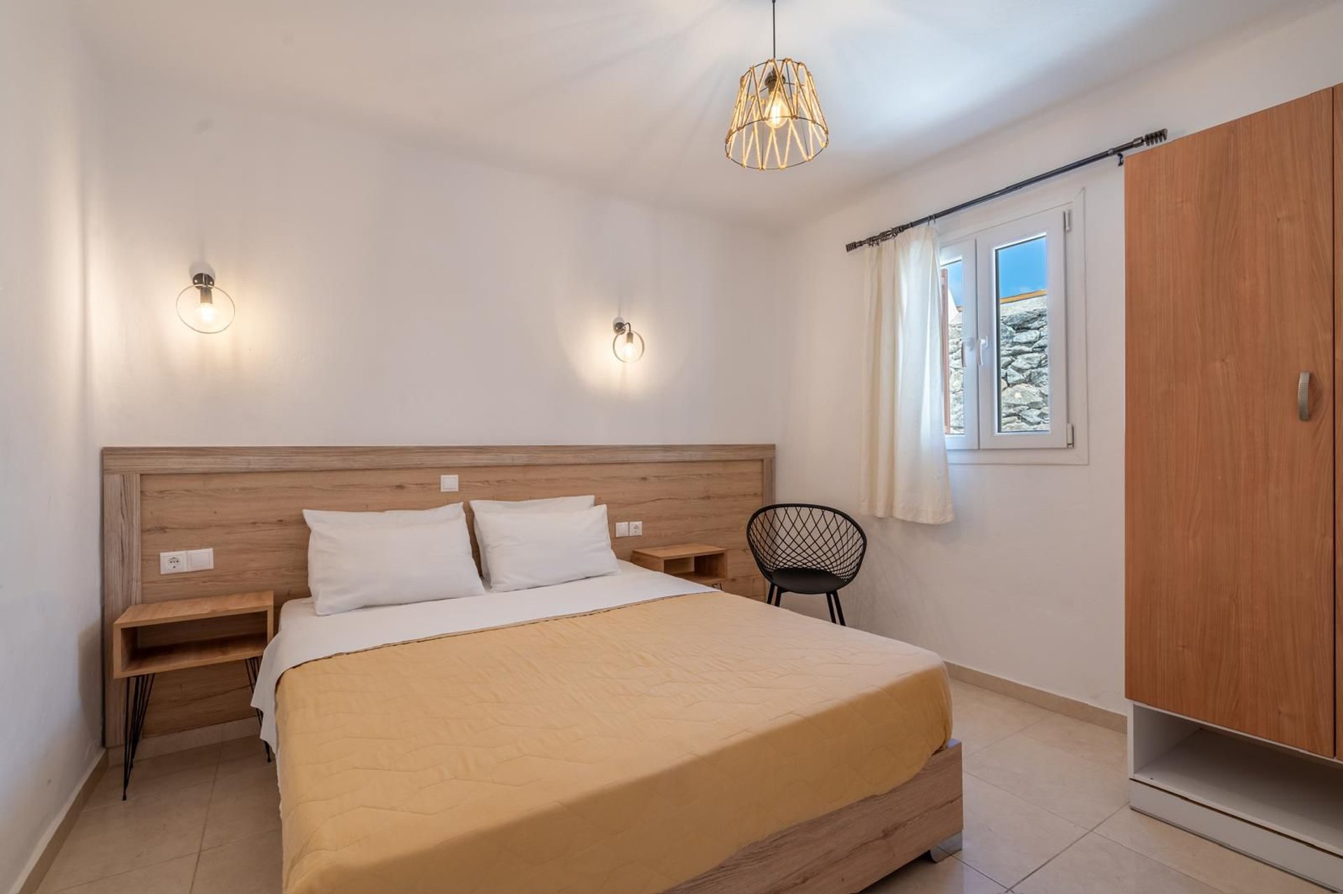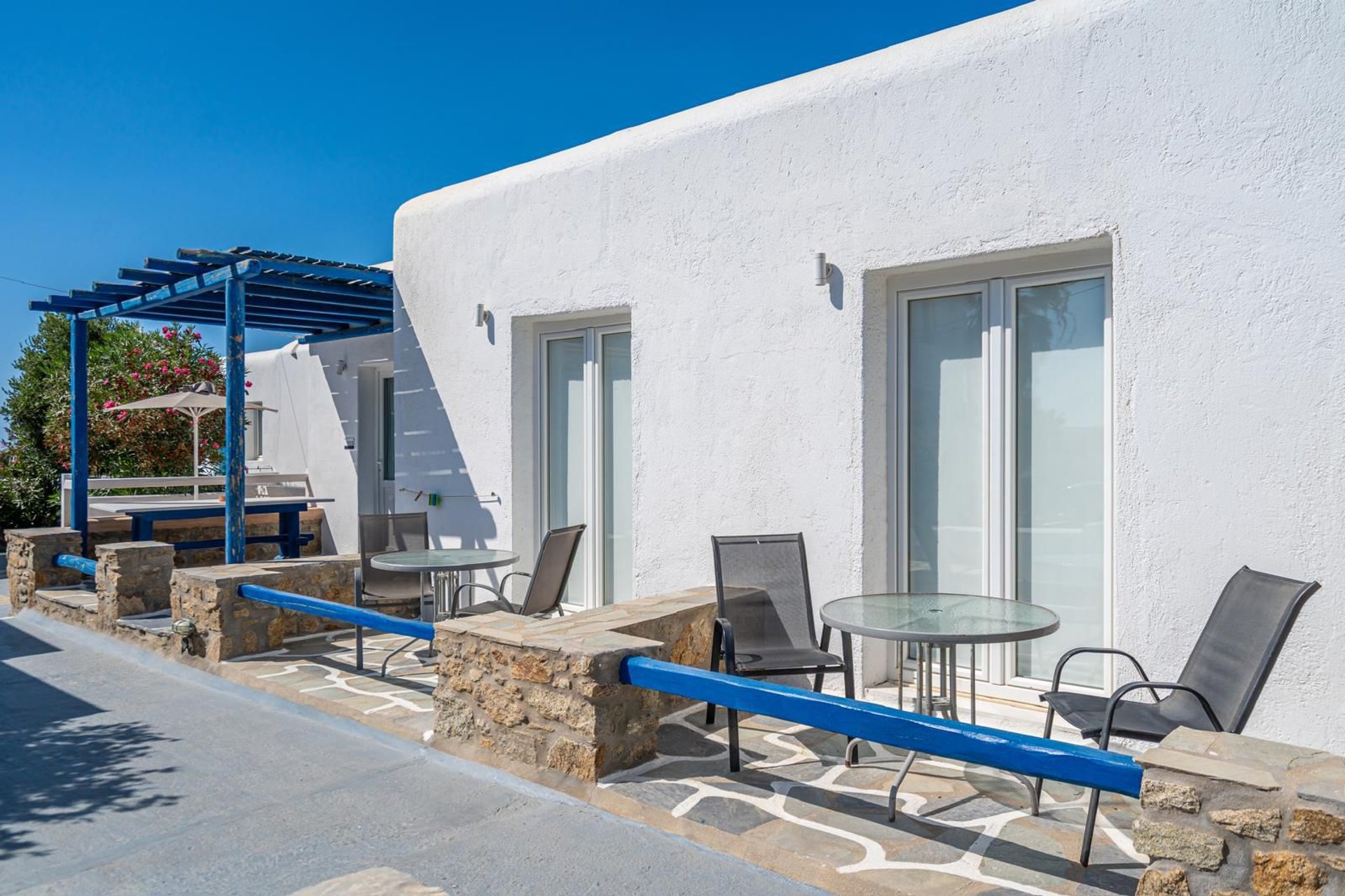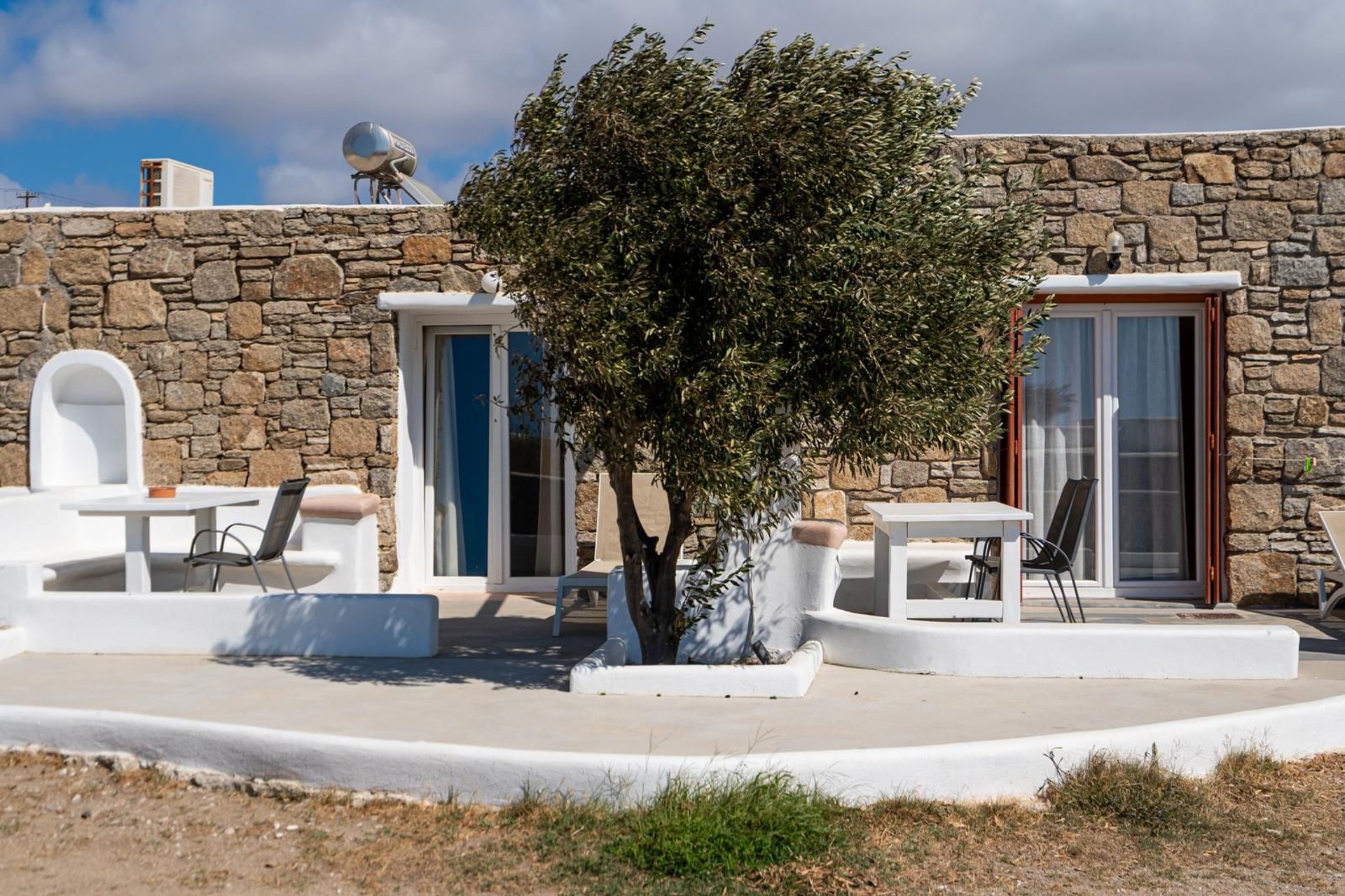 Le camere, recentemente ristrutturate, combinano lo stile mykoniano tradizionale con comfort moderni. Dispongono di terrazza o balcone arredato e sono dotate di aria condizionata, TV, frigorifero o minibar; alcune unità includono anche una cucina, ideali per soggiorni più indipendenti.