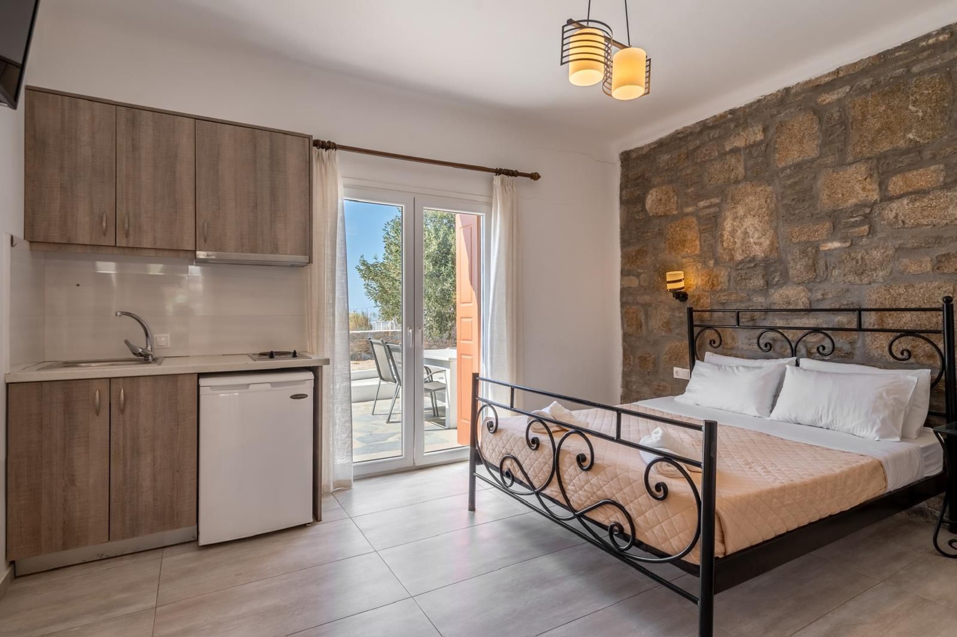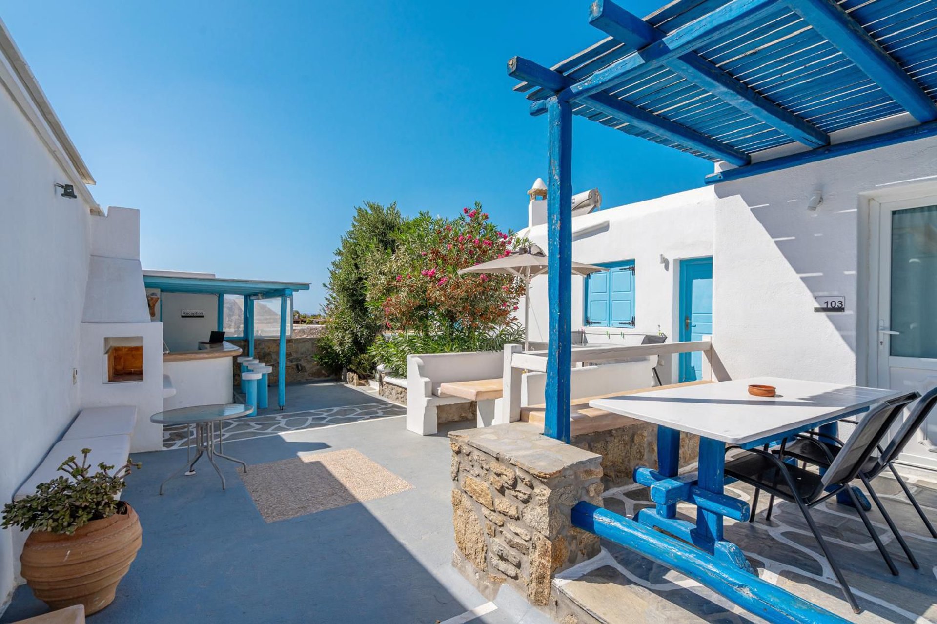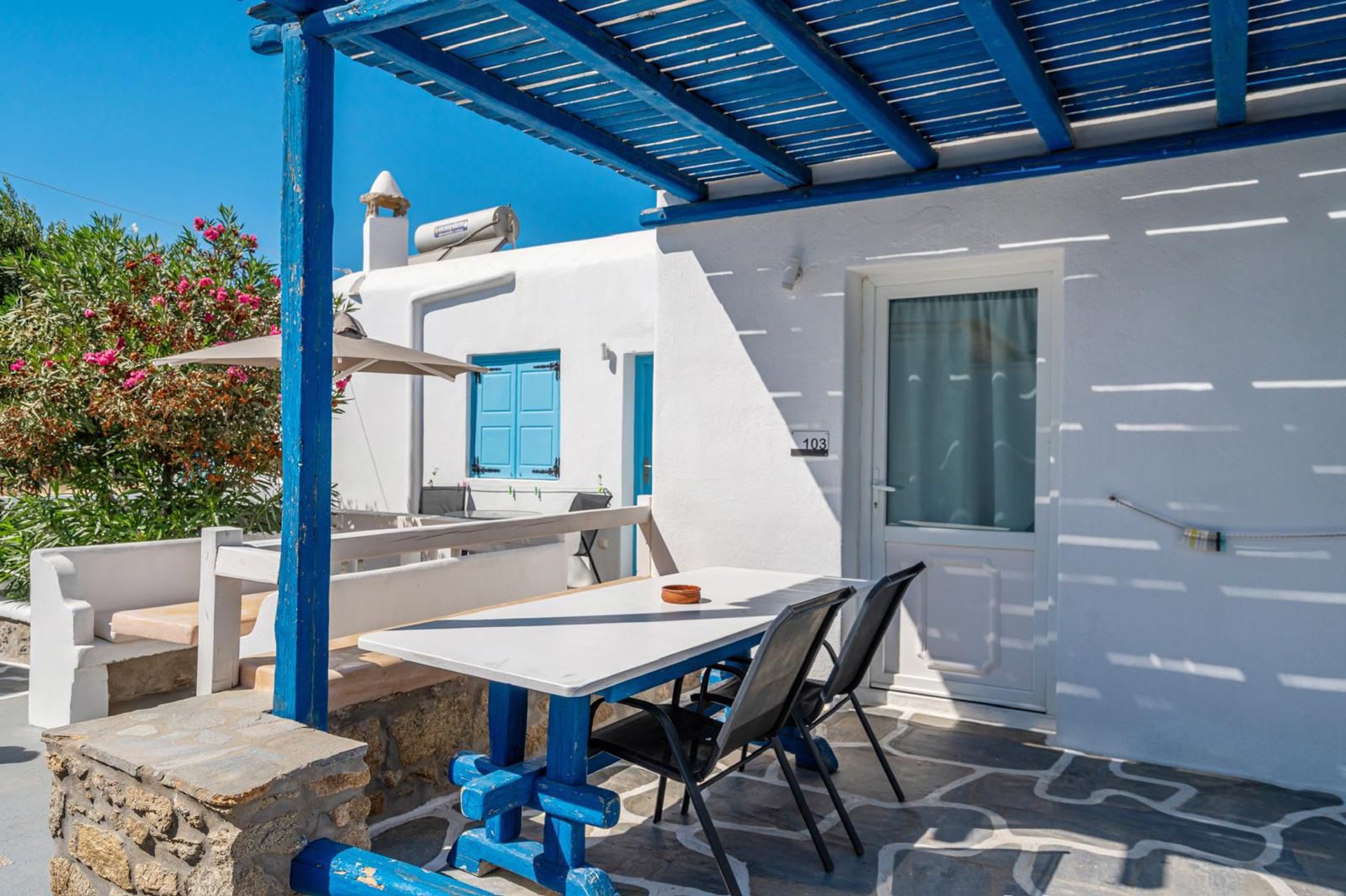 Situata in una zona strategica di Mykonos, la struttura si trova a pochi minuti dal centro, dal porto e dall’aeroporto, ed è perfettamente collegata alle principali spiagge e alla città grazie alla fermata dell’autobus proprio davanti all’ingresso. In soli 5 minuti di auto o moto è possibile raggiungere ristoranti, bar e negozi, rendendo la location ideale per vivere l’isola in totale libertà.